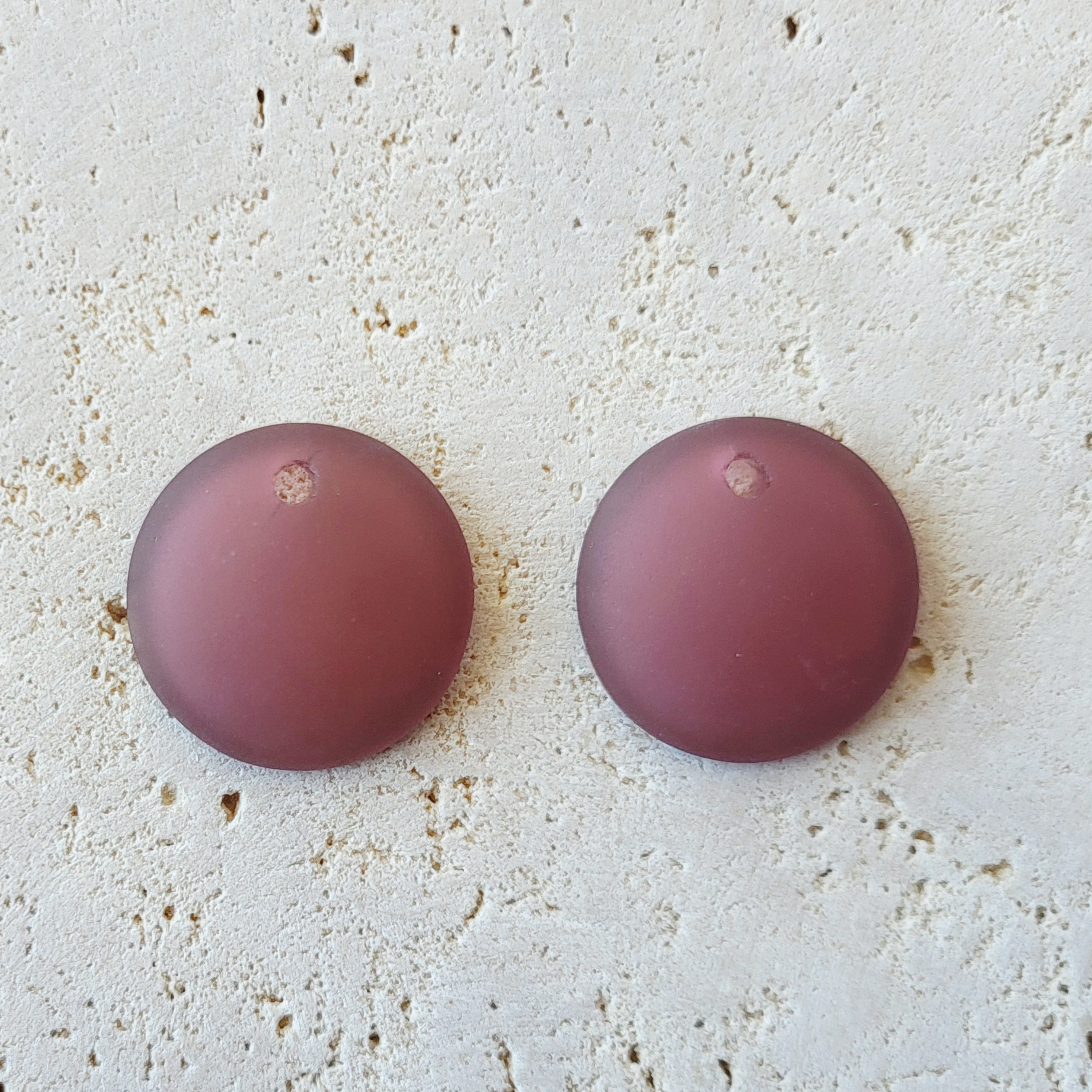 2 pendentifs ronds sea glass, concaves. Ils sont réalisés avec du verre recyclé. Le verre est soumis à un processus artificiel qui simule l'effet de plusieurs années d'érosion par la mer. Certaines perles ont une surface dépolie et d'autres un aspect érodé.